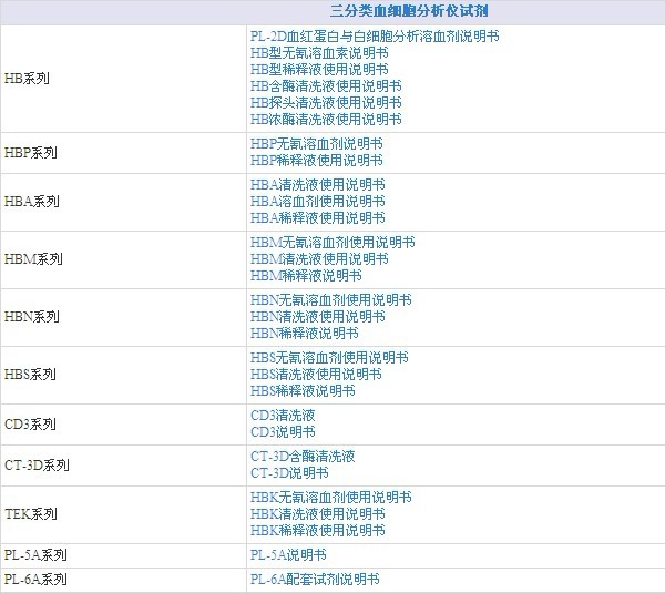 三分類血液細(xì)胞分析儀試劑參考表: